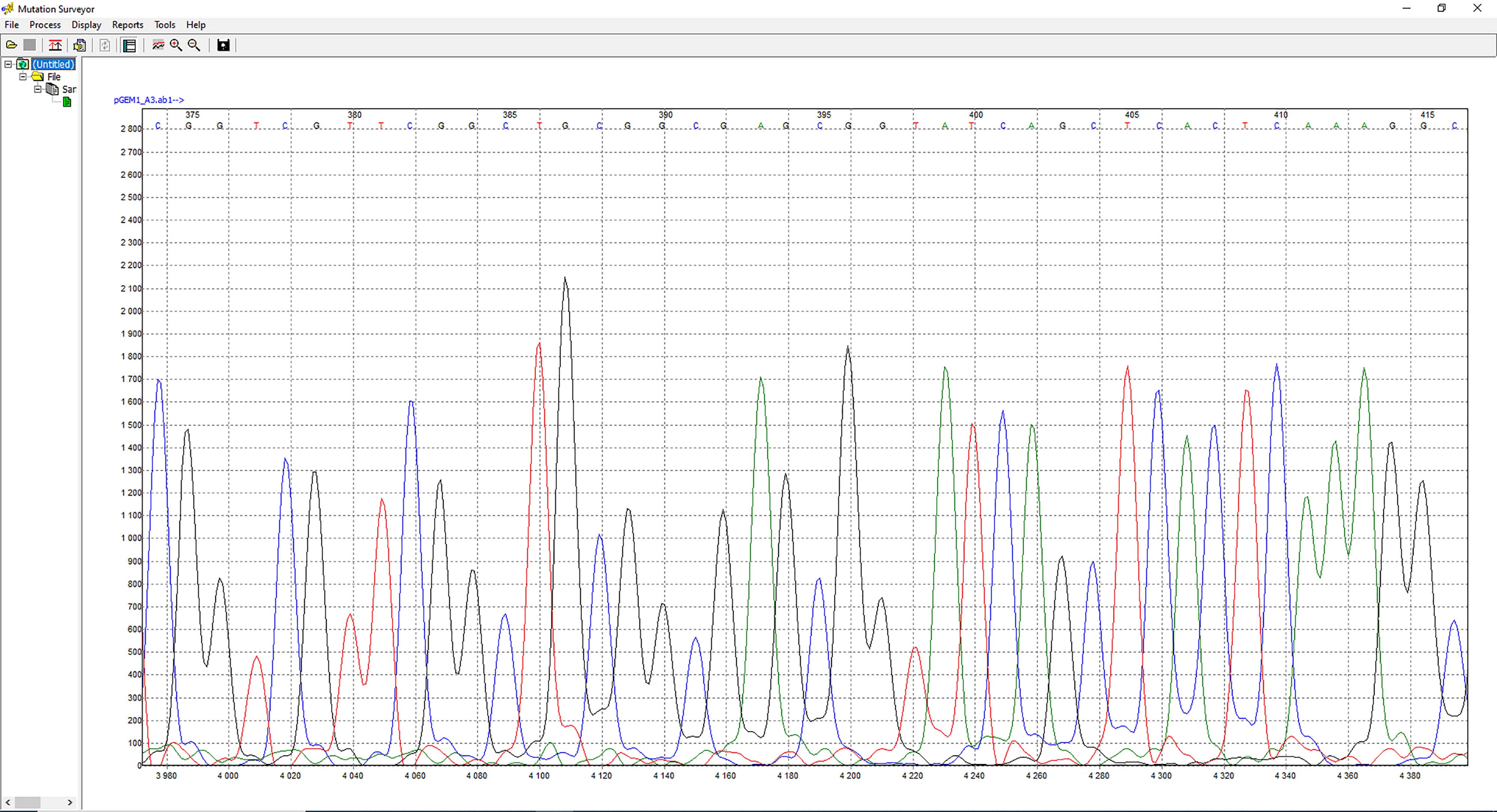 Графическое изображение (электрофореграмма) нуклеотидной последовательности плазмиды pGEM, полученное на генетическом анализаторе Нанофор 05. Отображены уровни сигналов флюорисценции (внизу) и соответствующие им нуклеотиды (вверху).