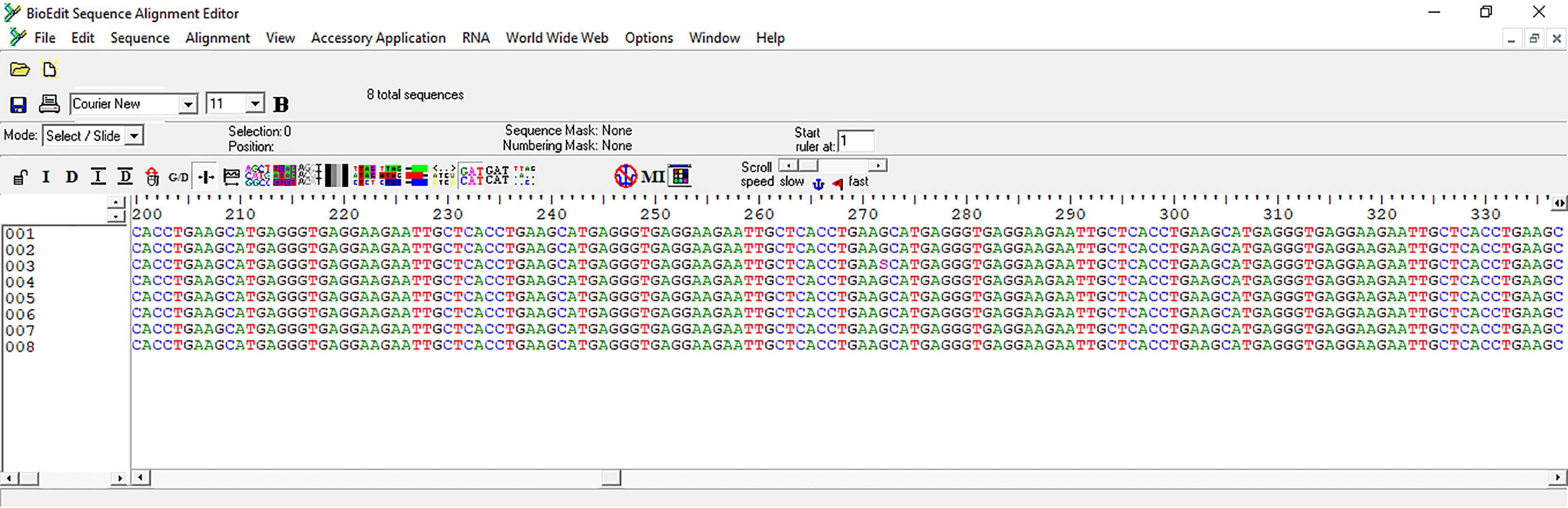 Выровненные последовательности ДНК. Данные представлены в формате *.fas в программе BioEdit